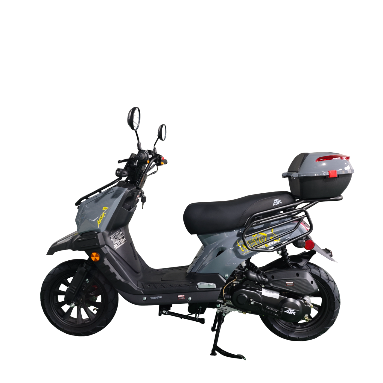 Agile 50cc scooter equipped with a single-cylinder, air-cooled 4-stroke engine and electric/kick start. It comes with double rear shocks, front disc and rear drum brakes, LED lights, and a phone holder. Smooth ride and efficient for city travel, max speed 35 mph.