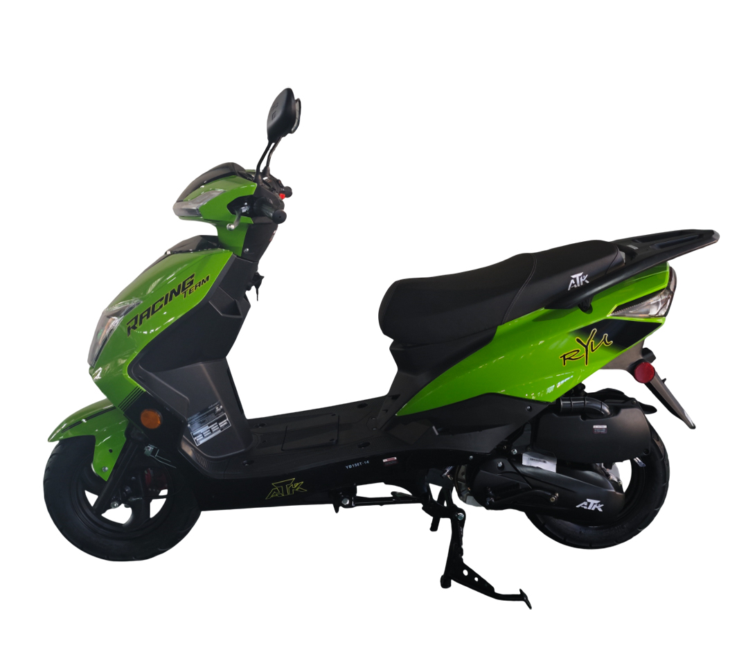 Sporty 150cc scooter with a single-cylinder, air-cooled 4-stroke engine. Designed with double rear shocks, front disc and rear drum brakes, and LED lights. Includes a phone holder and offers a responsive ride up to 60 mph.